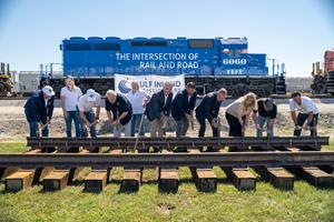The Gulf Inland Logistics Park team and elected officials take part in a rail spike ceremony.